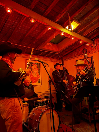 Smokey Hormel and his band play western swing every Wednesday night at Sunny’s Bar in Red Hook, Brooklyn. [l-r Charlie Burnham (fiddle), Peter Grant (drums), David Hofstra (Upright Bass), Smokey Hormel (guitar)] March 4, 2026. Photo: RR Sigel.